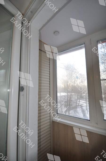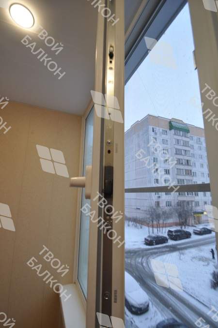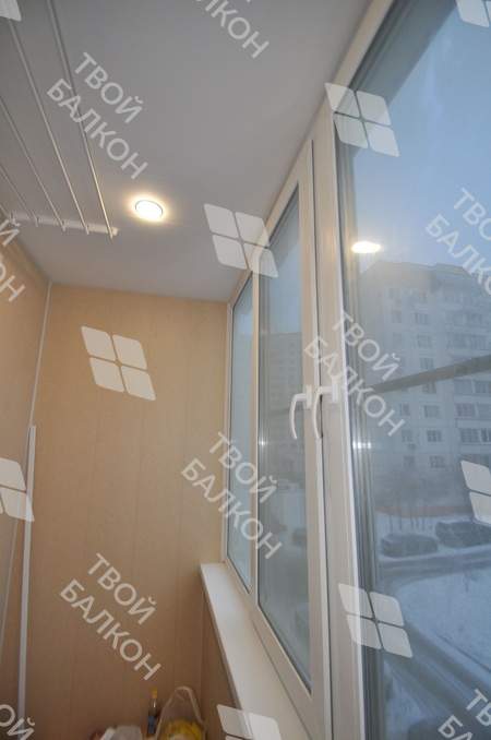 Сделано остекление балкона, установлены новые окна на место старого балконного блока, отделка лоджии с утеплением в многоквартирном панельном доме. Отделка стен и потолка выполнена пластиковыми панелями, полы ламинат, проведена и подключена электрика, установлен теплый пол. Изготовлено два шкафа: первый раздвижной из ЛДСП в алюминиевом каркасе, второй из рольставней. Установлены пластиковые окна и балконный блок из профиля Rehau Delight 70. В завершении работ была установлена потолочная сушилка. Материал предоставлялся компаний «Балкония» согласно пожеланиям заказчика.