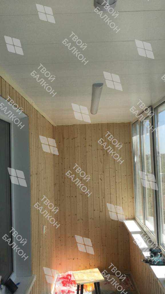 Реализованы работы по отделке балкона под ключ с утеплением, в многоквартирном доме. Сделано остекление лоджии ПВХ окнами, установлен балконный блок. Все окна выполнены из профиля Rehau Grazio 70 с энергосбережением. Сделано утепление. Отделка пола выполнена ламинатом, потолок панели пвх, фасадная стена и парапет вагонка из лиственницы. Выведено на балкон и разведено электричество. Установлены светильники. Подключен теплый пол. Материал предоставлялся компанией «Балкония» согласно пожеланиям заказчика.