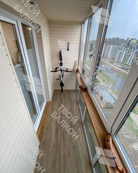 В данном объекте было выполнено панорамное остекление балкона системой ПВХ Rehau, что дало увеличение потока естественного солнечного света и полезная площадь балкона используется полностью. Сделано утепление, балкон обшит вагонкой липа, на пол постелен ламинат. Монтаж креплений для велосипеда - вариант оптимален для хранения нескольких транспортных средств. В результате отделочных работ получили полноценную площадь свободного назначения.